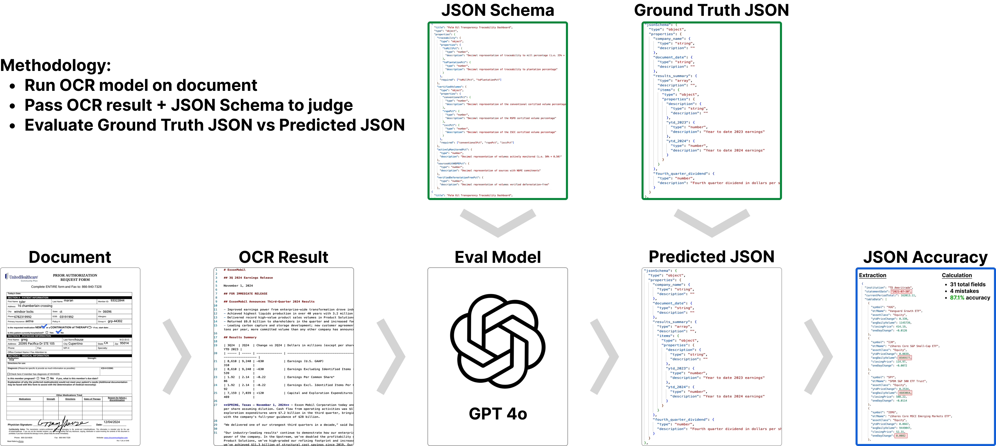 We are using GPT-4o as a judge. Passing in the OCR result + JSON schema using the structured extraction mode. We compare that to the ground truth JSON values to determine accuracy. Several LLMs with structured output were evaluated as judge (including GPT-4o, Claude 3.5 Sonnet, and Gemini 2.0 Flash). GPT 4o most consistently conformed to the JSON schema.