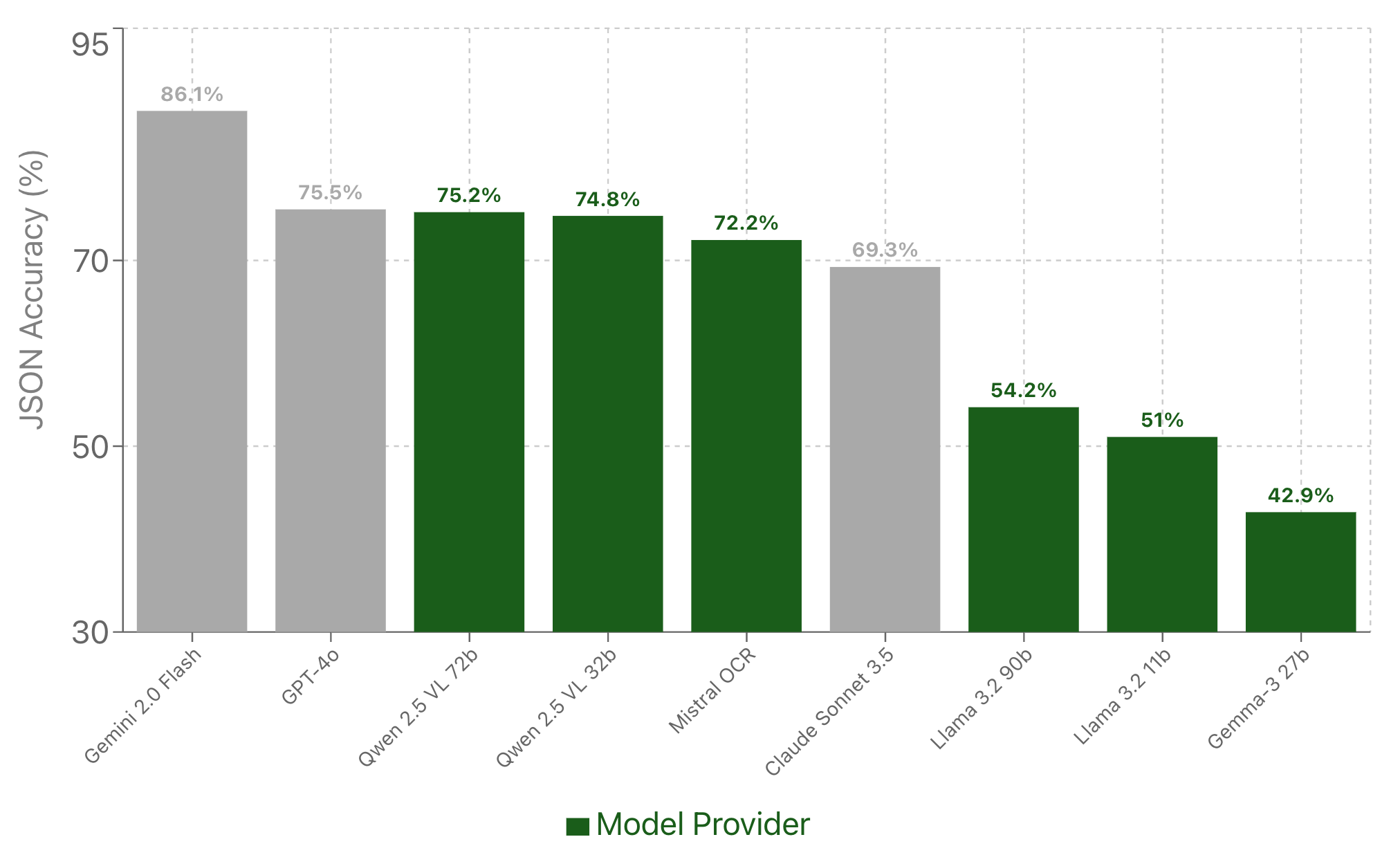 Qwen 2.5 VL (72B and 32B) are by far the most impressive. Both landed right around 75% accuracy (equivalent to GPT-4o’s performance).